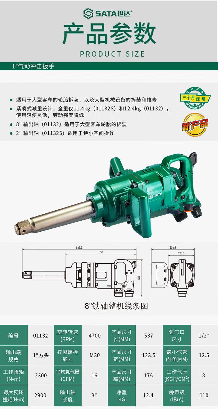 01132 1"方头气动冲击扳手(8"轴) 大扭力 适合大型客车轮胎拆装